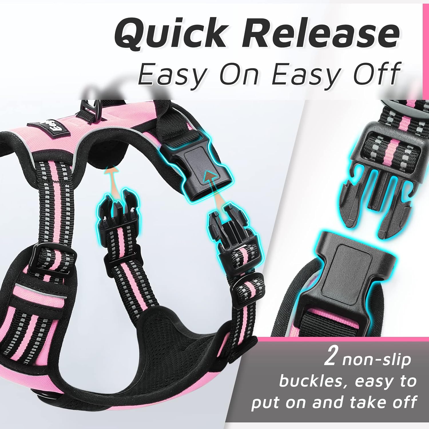 - Easy to Use: Our dog harness is designed with 2 quick-snap buckles for simple wearing and 4 adjustable sliders at the neck and chest for a perfect fit. Just slip it over your dog's head, buckle it up, adjust the straps, and you're ready to go in seconds