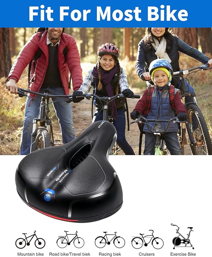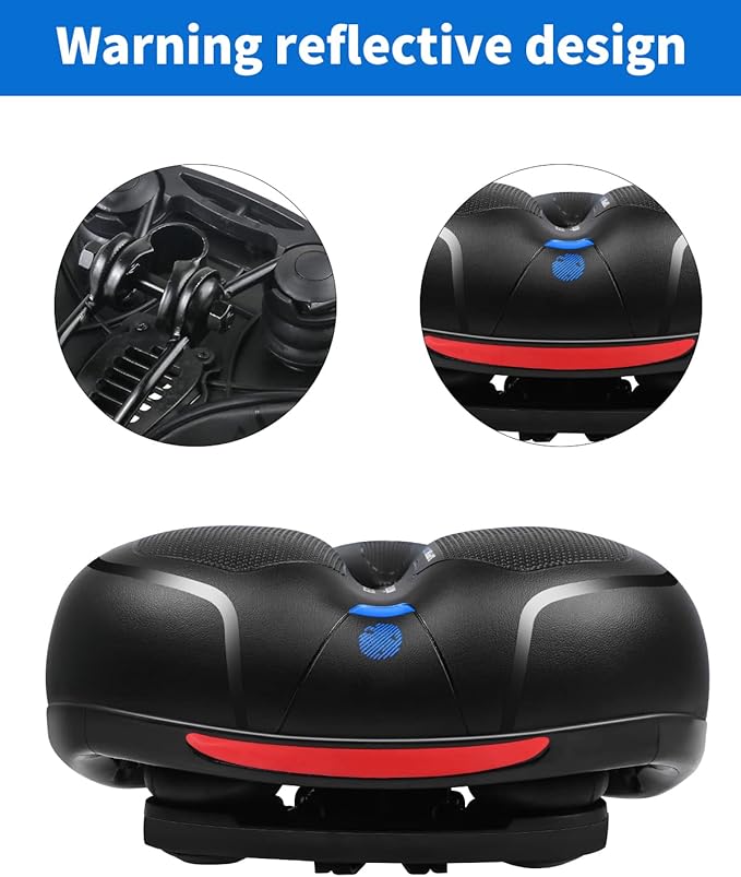 - 【Waterproof Bright Red Warning Strip Design 】Our wide bike seat comes with a red reflective sticker, can Improve eye-catching & safety when riding at night or rain! Note: The warning strip is just a reflective sticker not an LED light. To make your trip much safer, whether you ride your bike to work, school, in the park, around the block or even off-road, day or night, you will find this seat the perfect choice.