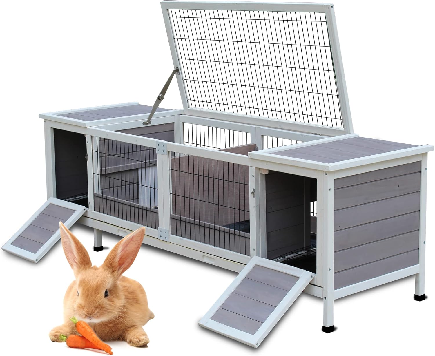- Easy to clean: It's easy to gain access to the inside by opening the side doors and the top wire for daily cleaning. Your pets can stay in the wood hut with the sliding door locked up while you are cleaning the pull out tray