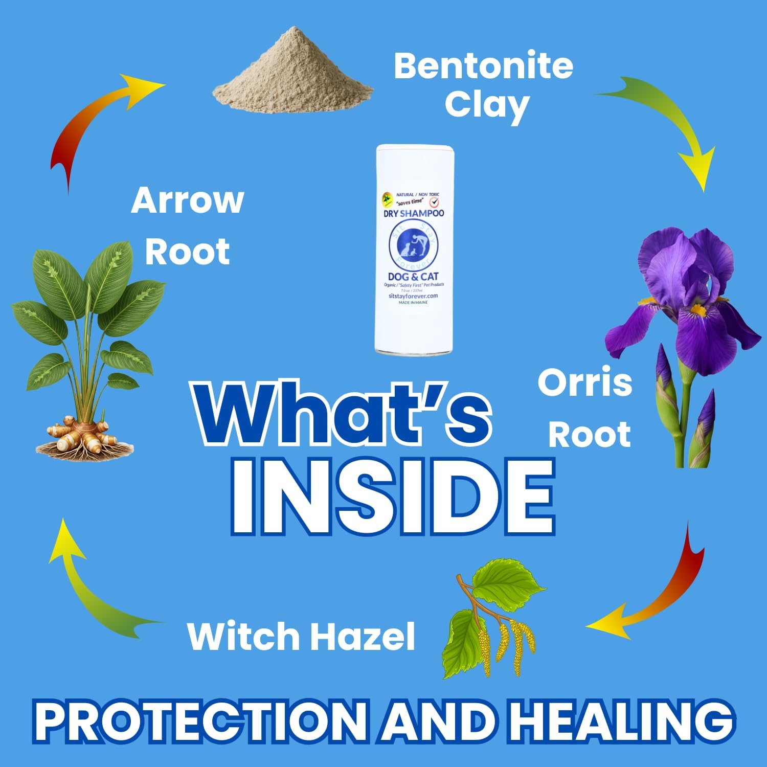 Sit. Stay. Forever. Dry Shampoo for Dogs & Cats – Organic Dry Bath Powder, Talco para Perros, Hypoallergenic, Odor Control for Smelly Dogs, No-Rinse, Anti-Itch, Safe & Natural, Made in The USA, 7 oz