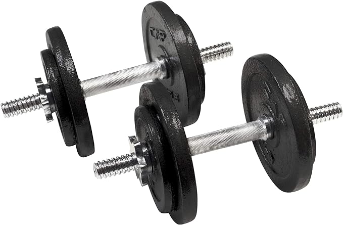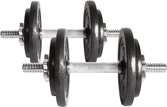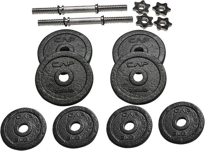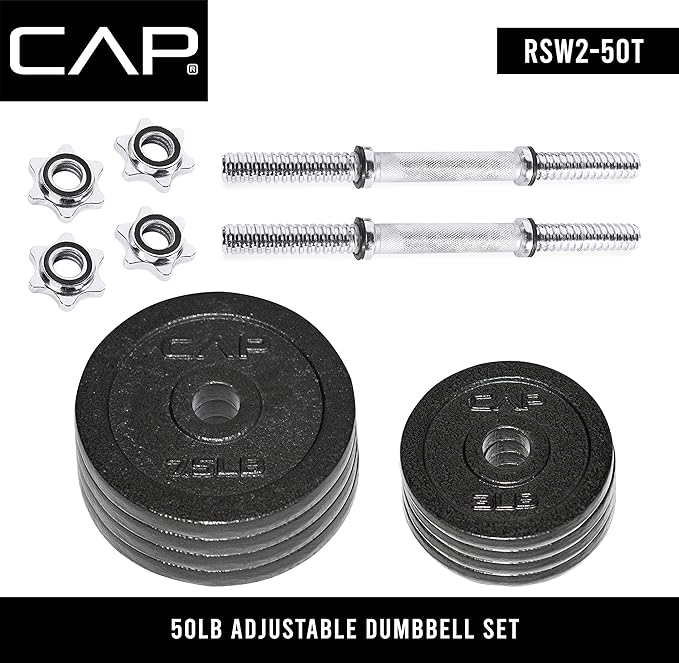 - Set includes – 50 pounds Total: two 14” dumbbell handles, four 3-pound plates, four 7. 5-Pound plates, and four star-lock collars. Great for targeting Individual muscle groups or incorporating into a full body workout.