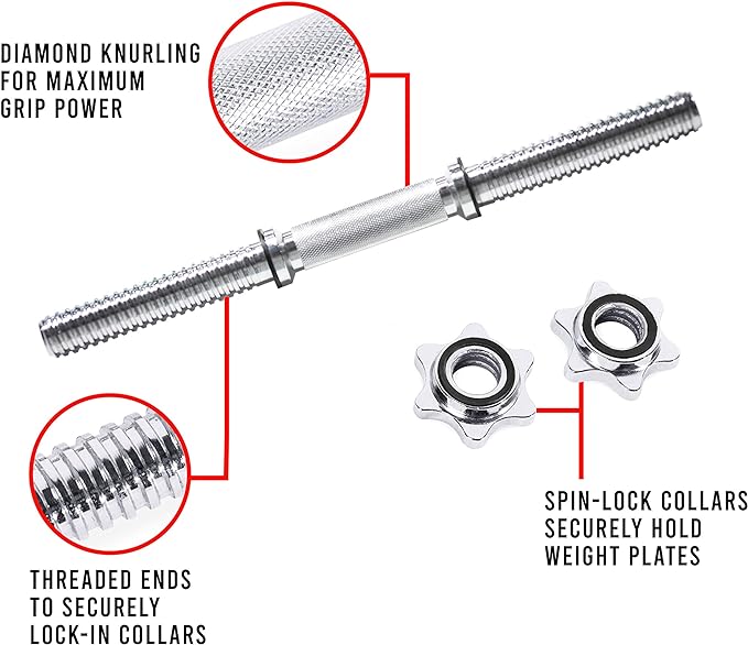 - Star-lock collars with rubber O-ring – course thread star collars are easy to tighten and loosen on threaded ends and help keep the plates in place when weightlifting.