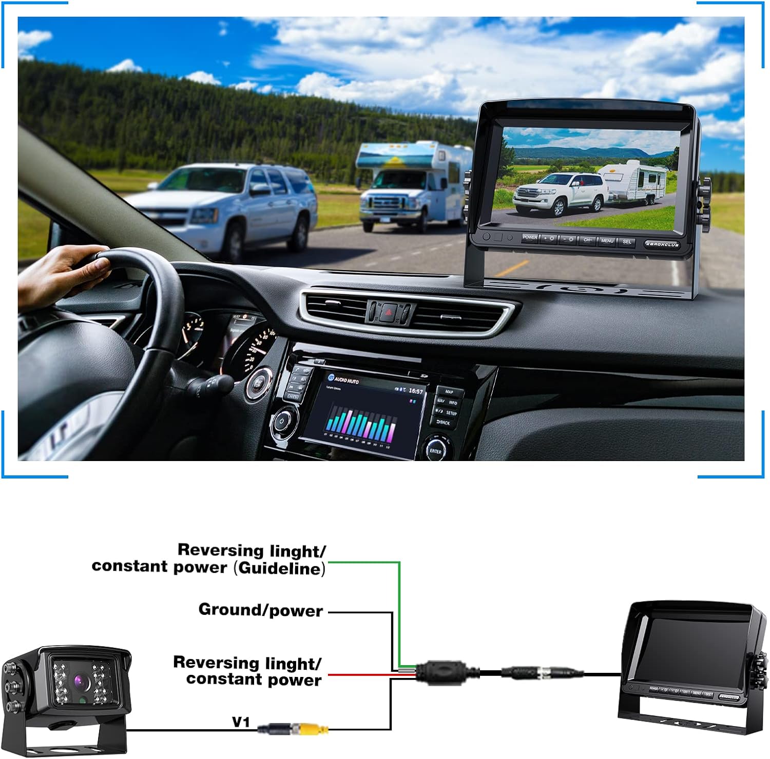 - 【IP69 Waterproof & Support 2 Cameras】With IP69K waterproof design, it is a reliable driving assistant whether it is rainy, foggy or snowy. And this wired backup camera system supports 2 cameras, you can search B082HKJ4XC to add an extra camera.