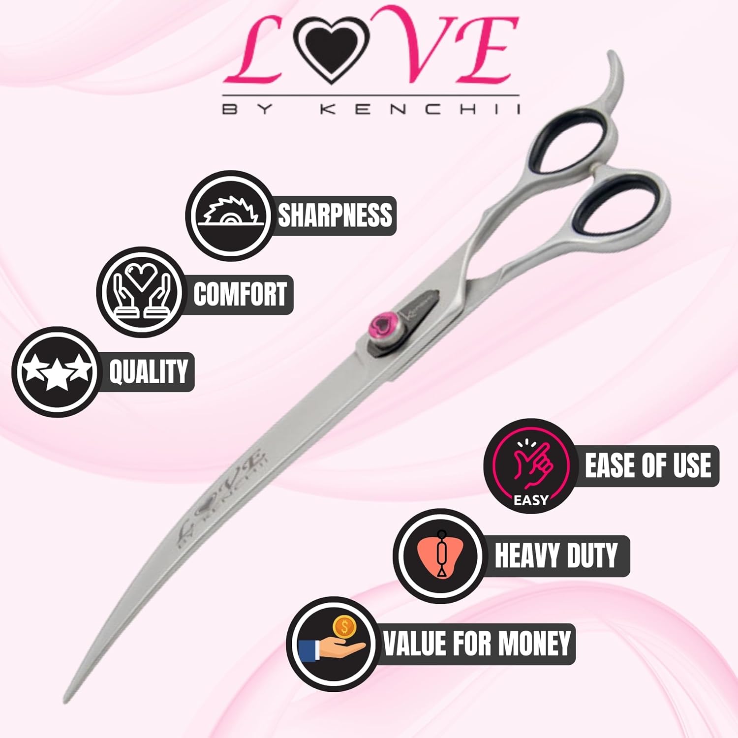 Kenchii Love Left Handed Dog Grooming Scissors, 9 Inch Curved Shears, Dog Scissors for Grooming, Professional Pet Grooming Scissors, Ergonomic & Comfortable