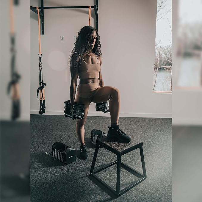 - COMPACT & PORTABLE: The adjustable, convenient, and compact dumbbells provide innovative strength training for an easy-to-use solution. Bring the workout with you anywhere. Dimensions are 12.5” L by 7” W by 7.25” H.