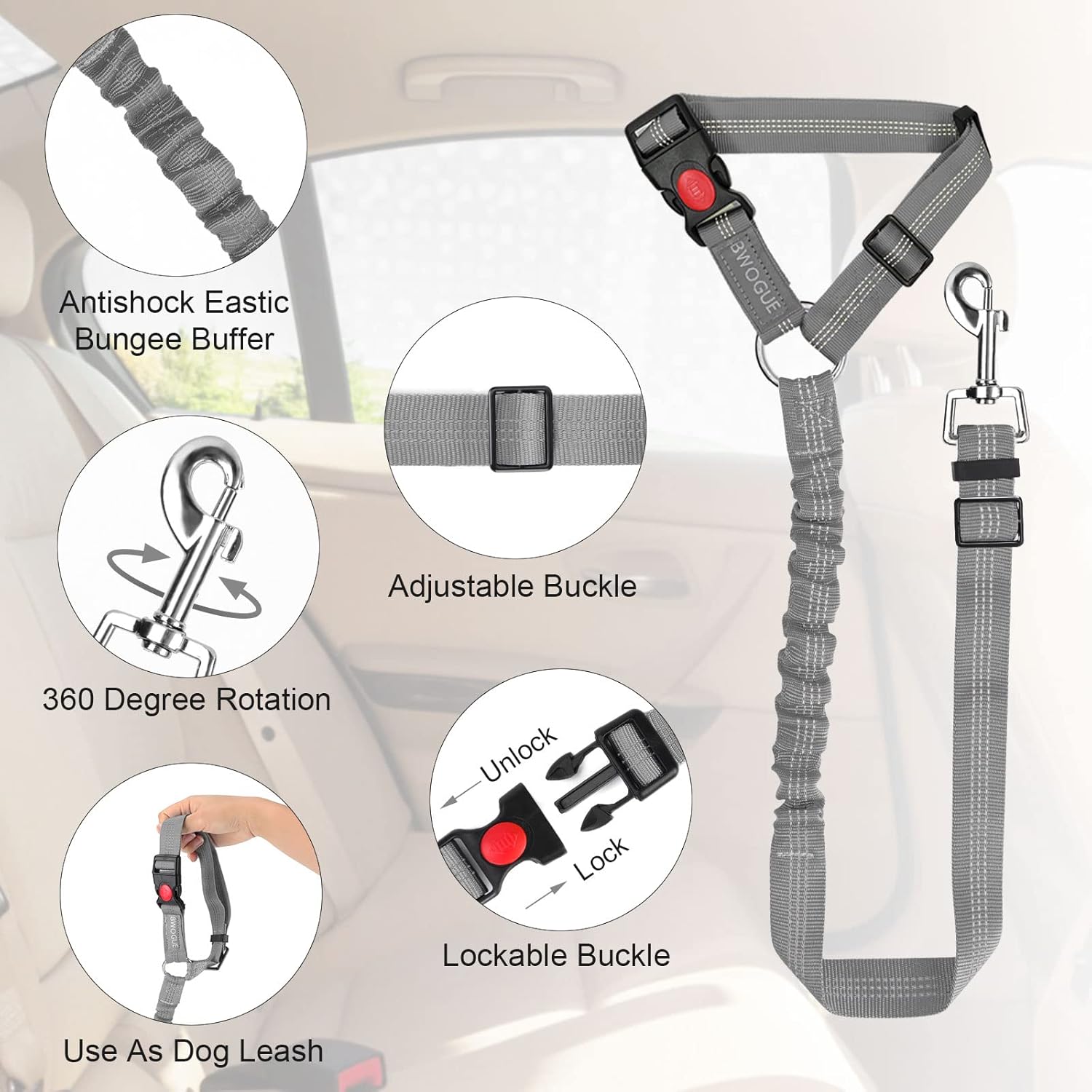 - ADJUSTABLE LENGTH: Dogs come in different sizes and weights. With buckle on the straps and the elastic bungee inside, The BWOGE Headrest Restraint is adjustable between 18.9-27.5 inches and can be stretched to 31.5 inches for the maximum length. The circle can be adjusted from 17.7 inches to 25.6 inches.You can easy to adjust the dog leash to the suitable length to keep your pet in a safety state.