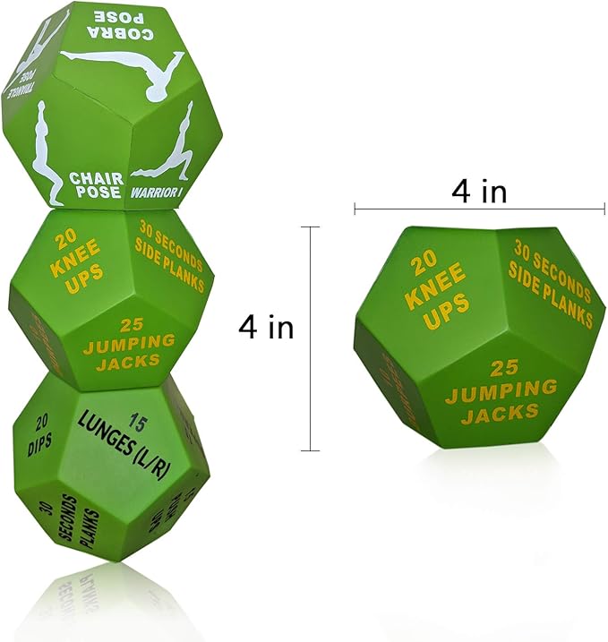 - ✅ SIMPLE & FUNCTIONAL -Set of 3 EXER-DICE with Exercise manual & Mesh carrying bag included. LIGHT & EASY - Made out of light weight foam making it easy to take anywhere. GREAT SIZE! Our dice are 4x4 inches which allows you to clearly see exactly what exercise you hit without being too big causing them to be an inconvenience.