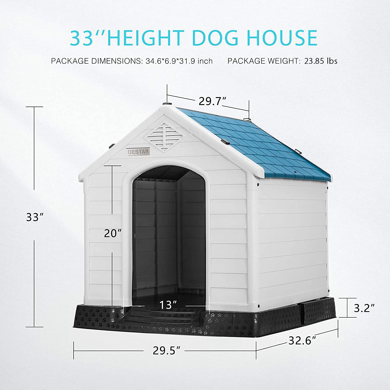 - LARGE & STURDY HOUSE - The dog house is large enough for dogs of different sizes; Please check the dimensions before buying; Overall Dimension: 32.6"(L)*29.5"(W)*33"(H); Door Dimension: 13"(W)*20"(H); The interior space is designed for small or medium pets; Made of sturdy and thick PP plastic that is anti-corrosive and anti-rust, it is durable to be used on outdoors places like patio and backyard