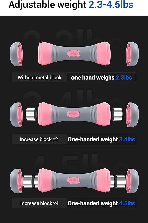 - MULTI-WEIGHT SETTING: The dumbbell alone weighs 2.3 lbs. each. Weight bars are included to allow you to adjust the weight of your dumbbell. There are 4 weight blocks total for each dumbbell. Each weight bar weighs 0.55 lbs. In order for the sides to be even, you must add them equally on each side. The lowest weight is 2.3 lbs. and the highest weight is 4.5 lbs. per dumbbell.