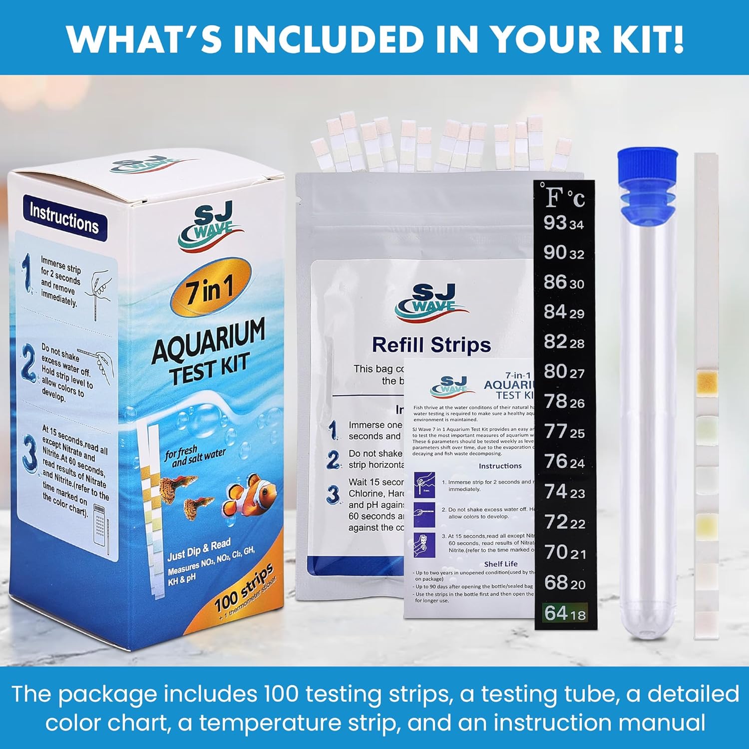 7 in 1 - Aquarium Test Strips | 100 Fast & Accurate Strips | Fish Tank Aquariums Water Test Kit & ebook | Aquarium Thermometer | Fish Tank Water Testing Kit for Fresh & Saltwater | Versatile Usage