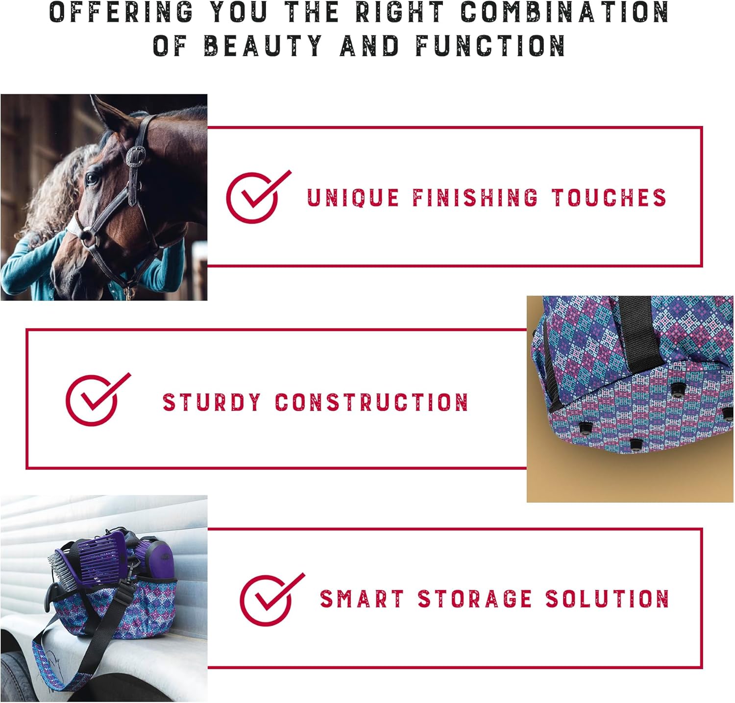 - Comfortable and Portable: Designed for easy use, the adjustable grooming bag for horses includes comfortable webbing handles and soft padded shoulder strap with on and off snap; effortlessly carry this lightweight equine grooming kit wherever you go
