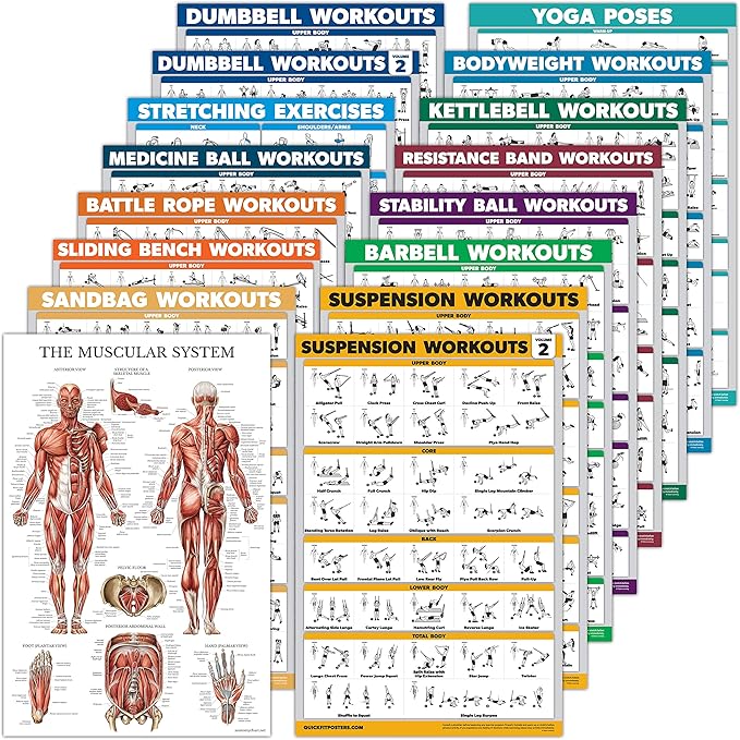16 Pack - Exercise Workout Poster Set: Dumbbell , Suspension , Kettlebell , Bands , Medicine Ball , Battle Rope , Stretching , Bodyweight , Barbell , Yoga , Exercise Ball (PAPER - NOT LAMINATED , 18" x 24" )