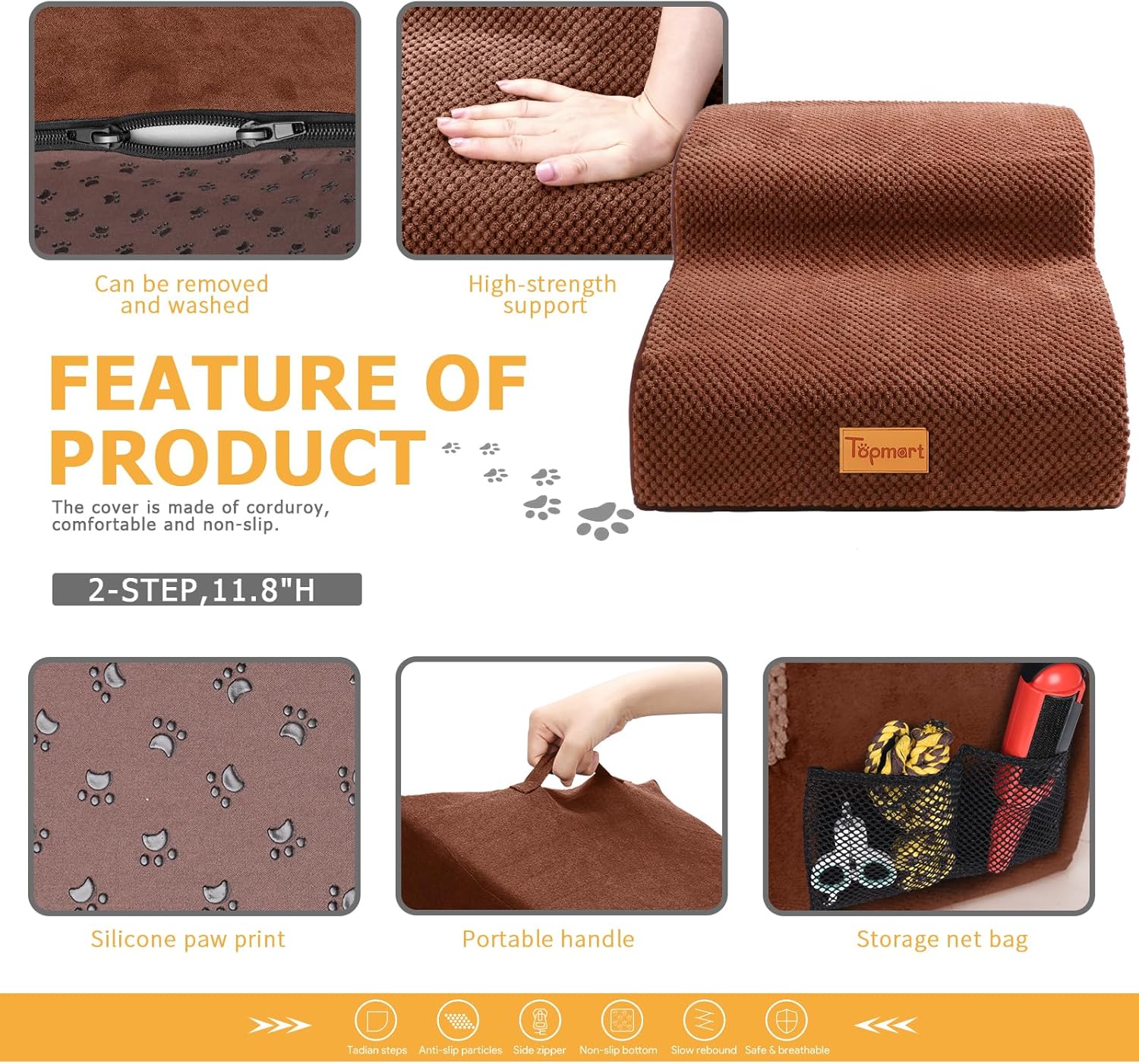 - Safer,Wider&Deeper Steps:Our dog stairs are excellent for those older dogs who are less mobile as they age or for cats with injuries. More wide and deep steps are helpful for reducing the strain that constantly jumping up and down onto lower bed,sofa can have on your pet's joints,and topmart dog steps will not shake and slip during use. The cover made of corduroy is more frictional than other covers, pets will not slip on the stairs.