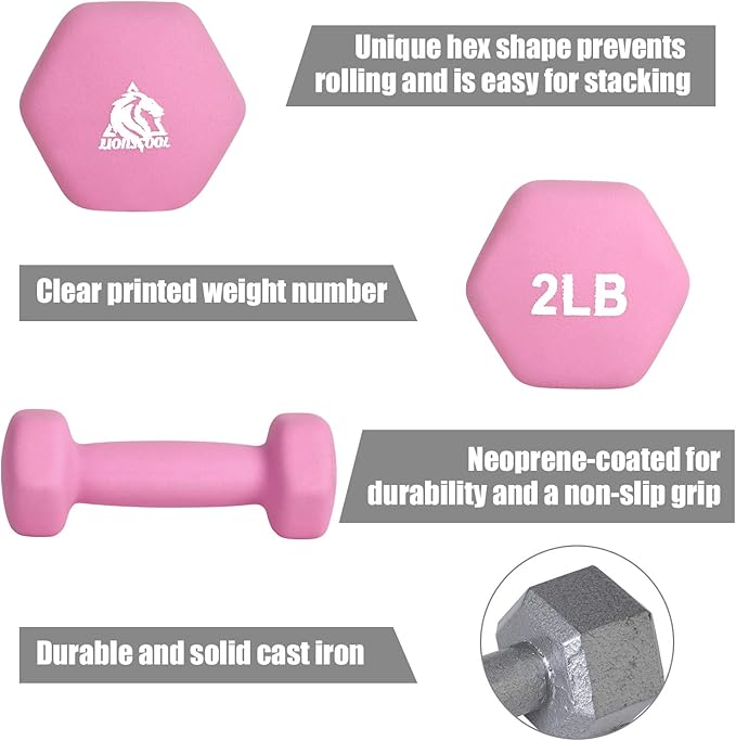 - Comfortable Grip and Anti-Roll Design: The neoprene coating on LIONSCOOL dumbbells offers a comfortable and secure grip and protects fitness equipment from getting damaged. The hexagonal shape of the dumbbell heads prevent the dumbbells from rolling away when setting them down to perform other exercises.