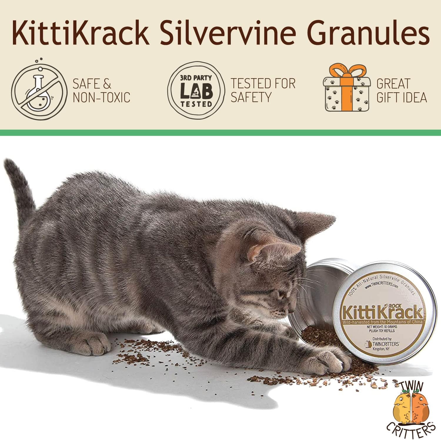 - Caring for your Cat: The continued good health of your fur-baby is our top priority here at TWINCRITTERS. This is why we’ve made our KittiKrack Rock Cat Toy Refill Granules from pure wild growing silvervine fruit without any additives or preservatives.