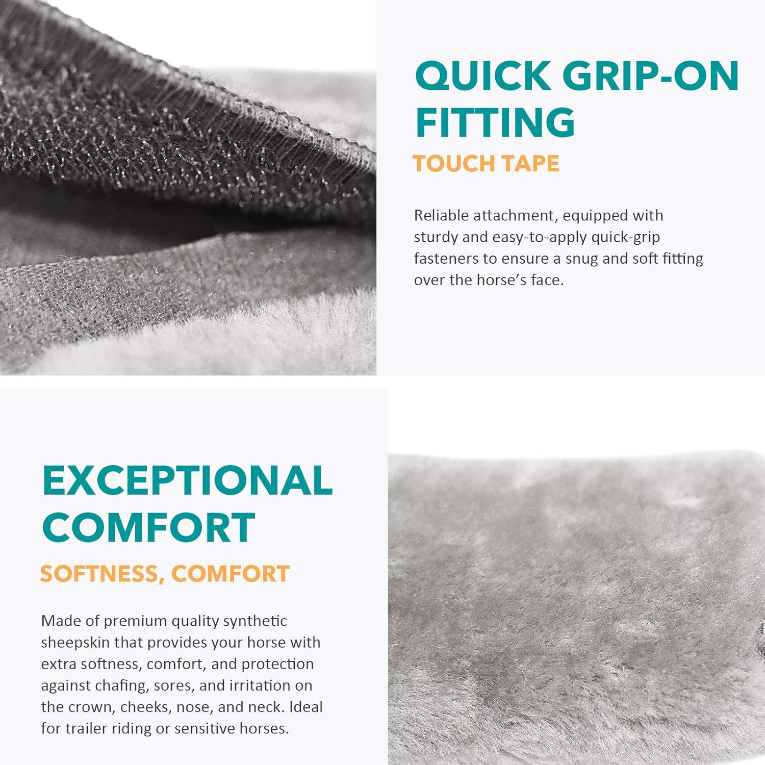- EXCEPTIONAL COMFORT: Made of premium quality synthetic sheepskin that provides your horse with extra softness, comfort, and protection against chafing, sores, and irritation on the crown, cheeks, nose, and neck. Ideal for trailer riding or sensitive horses.