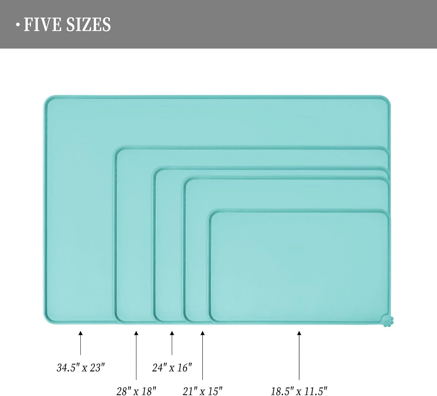 - Various sizes available: our pet mats come in 5 different sizes - 18.5" x 11.5", 22" x 14", 24" x 16", 28" x 18", and 32" x 24". Suitable for all kinds of pets, from puppies to large pets, choose the perfect size for your furry friends and avoid messy spills at mealtime