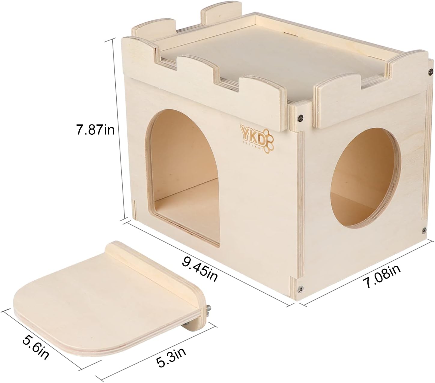 - Constructed with Premium birch Wood board - The YKD small animal house is durable, sturdy, and well crafted. Made from high quality wood, this small animal hideout is built to last! House Size - 9.45 x 7.08 x 7.87 inches (L x W x H), Door Size - 4.33x 4.92 inches (W x H), Hole Size - 3.74 inches (Diameter), Platform size: 5.3 x 5.6 inches (L x W ).