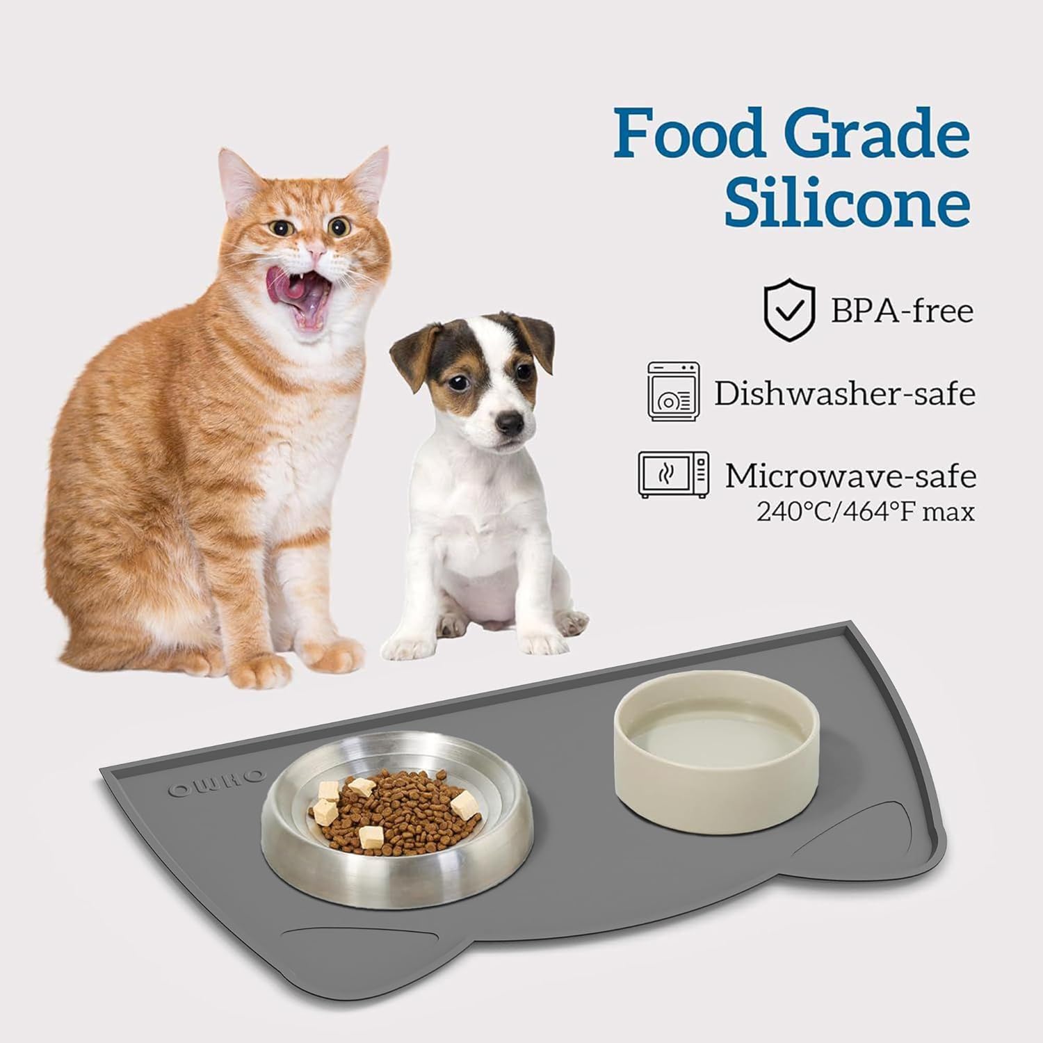 OHMO - Cat Food Mat, Silicone Pet Feeding Mat for Floor Non-Skid Waterproof Dog Water Bowl Tray, Easy to Clean Pet Placemat (Dark Grey, 18 * 9.8'')