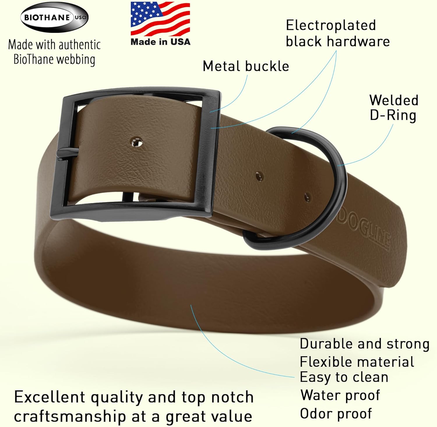 - Free Your Dog to romp in puddles and retrieve from lakes with the Dogline Biothane Waterproof Dog Collar. This water-repellent collar stays dry and odor-free, without shrinking or losing flexibility.
