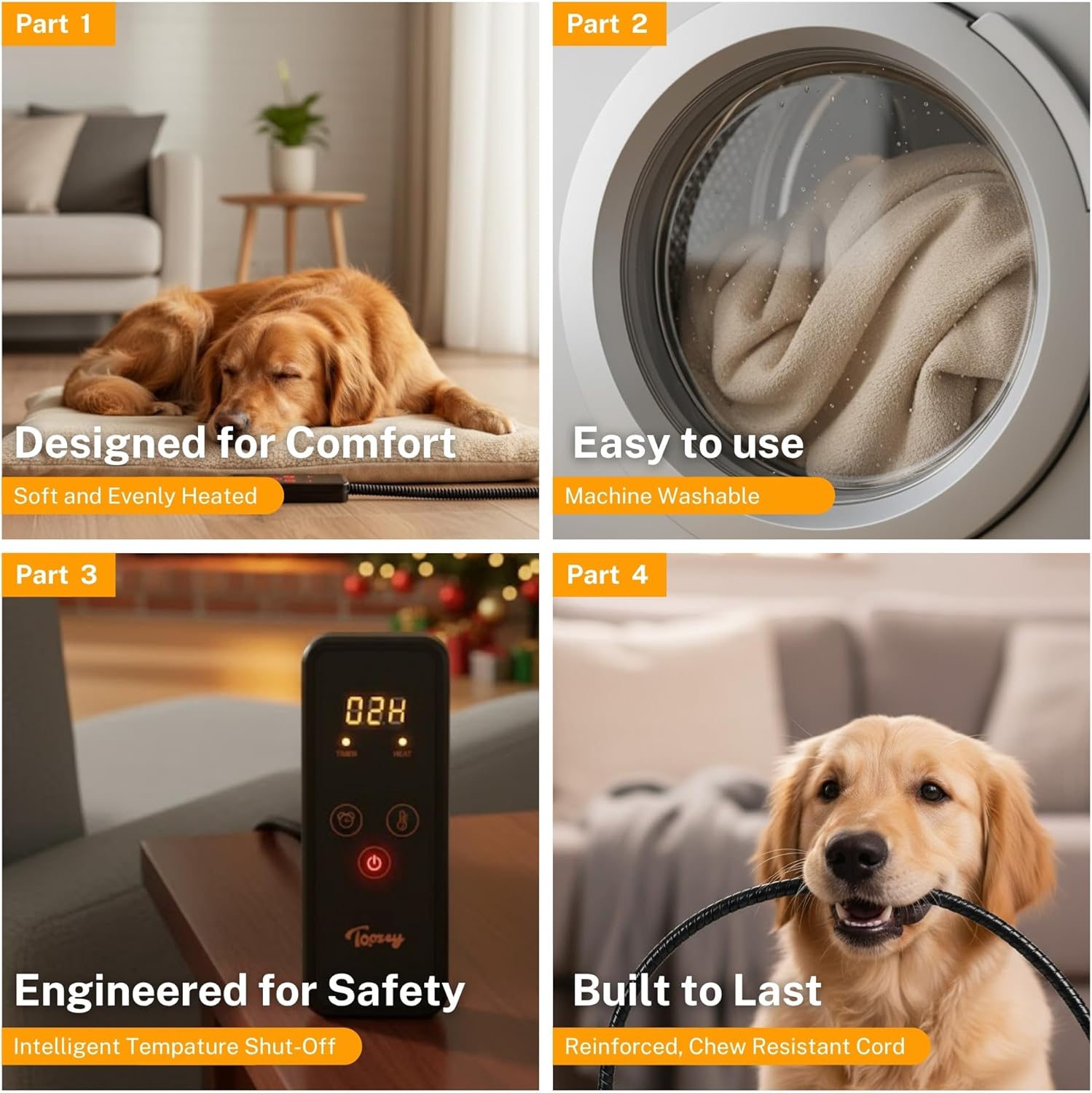 Toozey Pet Heating Pad, 6 Adjustable Temperature Dog Cat Heating Pad with Timer, Waterproof Heated Dog Bed with Chew Resistant Cord, Indoor Electric Pet Heated Mat 28x20in