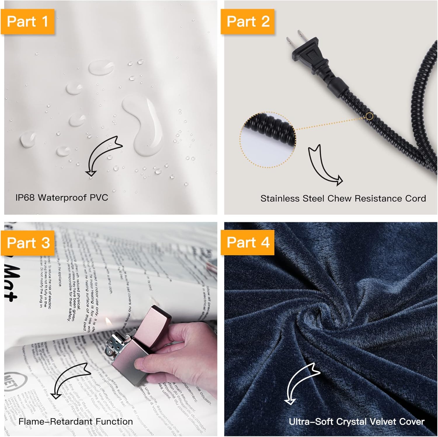 - ❤【Safety and Secure Structure】7-layer protective structure with UL-certified heating wire protect pets from burns. Soft PVC envelope with waterproof and flame-retardant function. Built-in intelligent temperature sensor in the heating pad to prevent overheating to protect pets. Don’t let your pets lay on the pet heating pad without a plush cover.