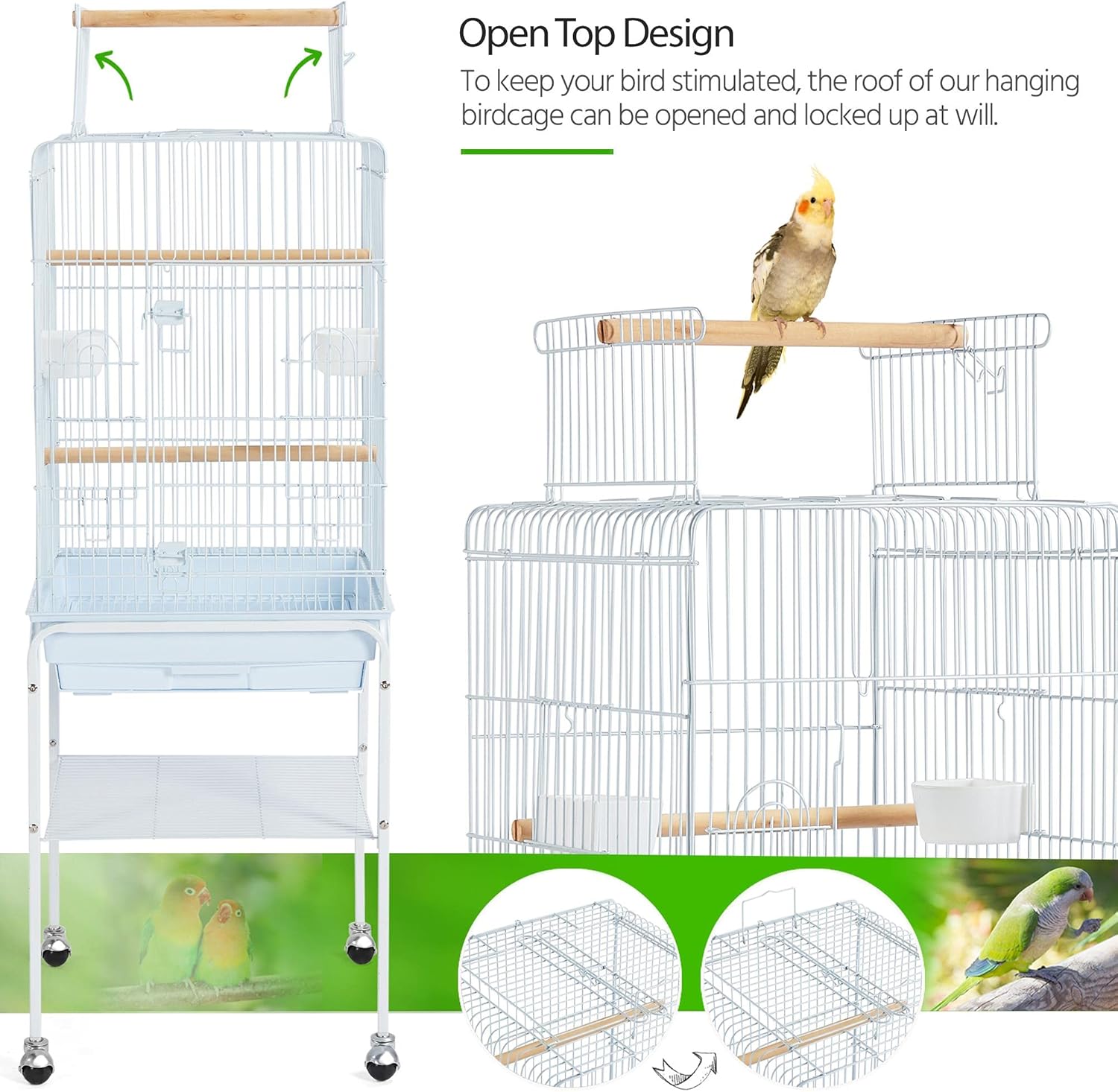 - Detachable Rolling Stand: This rolling bird cage sits on four 360-degree swivel ball-shaped wheels, making it effortless to move around. The upper cage can be used separately thanks to the detachable design. You can place/carry the cage without the stand at will