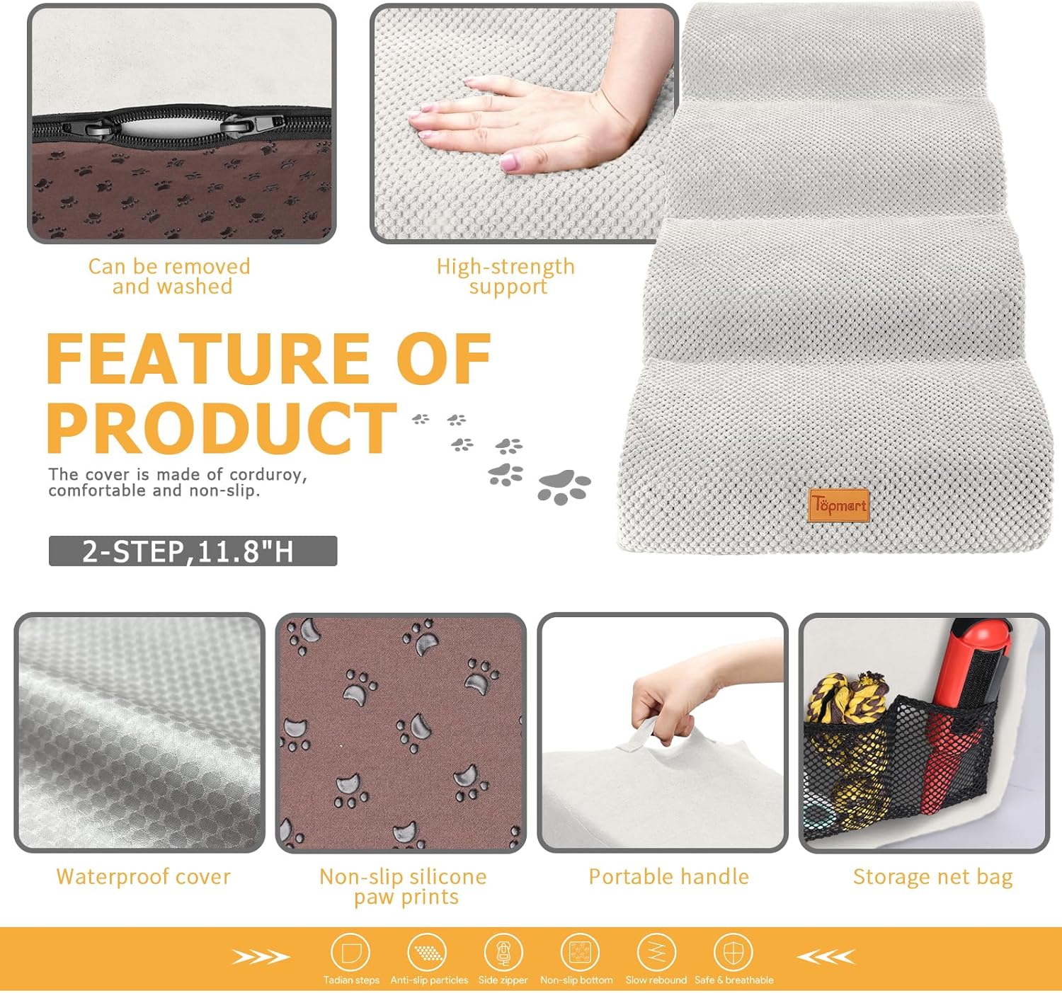 - Safer,Wider&Deeper Steps:Each step is 15.75in x 7.1in.Our dog stairs are excellent for those older dogs who are less mobile as they age or for cats with injuries. More wide and deep steps are helpful for reducing the strain that constantly jumping up and down onto bed,sofa or car can have on your pet's joints,and topmart dog steps will not shake and slip during use. The cover made of corduroy is more frictional than other covers, pets will not slip on the stairs.