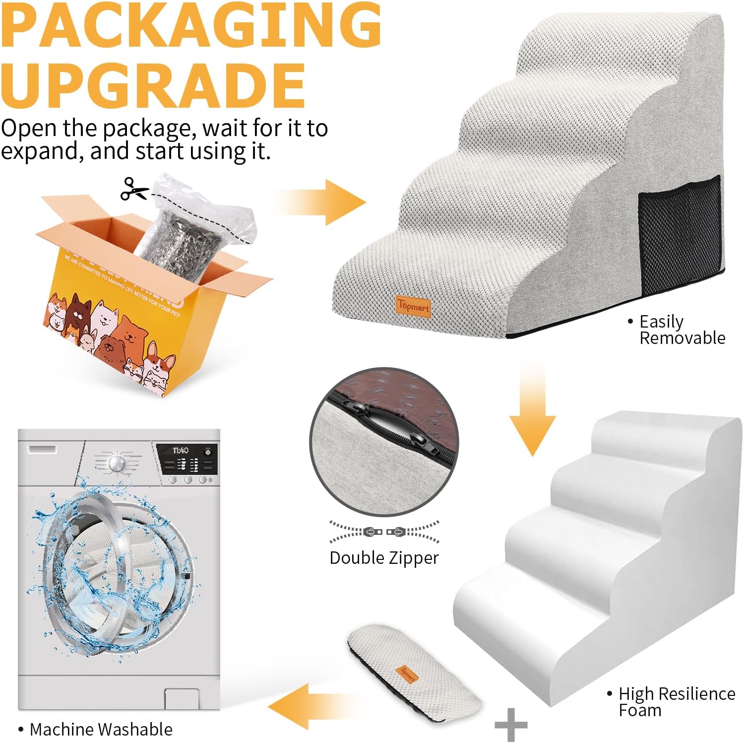 - High Quality Sponge: Made of 30D high-density sponge, strong resilience, not easy to deformation, very durable. Soft sponge provides a very comfortable touch to the pet. Even if the pet runs and plays or human accidentally hit the Topmart dog stairs will not be injured.