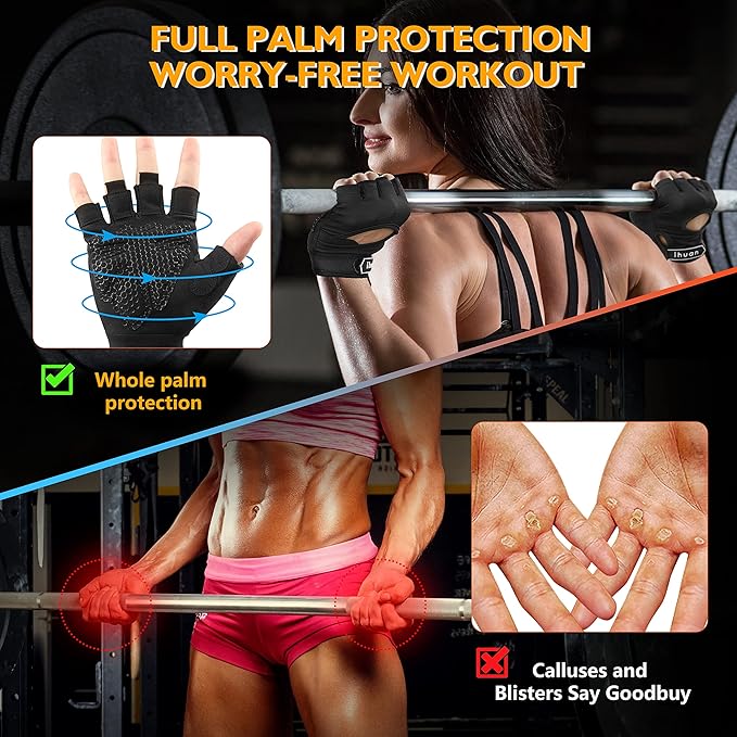 ihuan New Breathable Workout Gloves for Women & Men - No More Sweaty & Full Palm Protection Gym Exercise, Cycling, Fitness, Weightlifting, Pull-ups, Deadlifting, Rowing