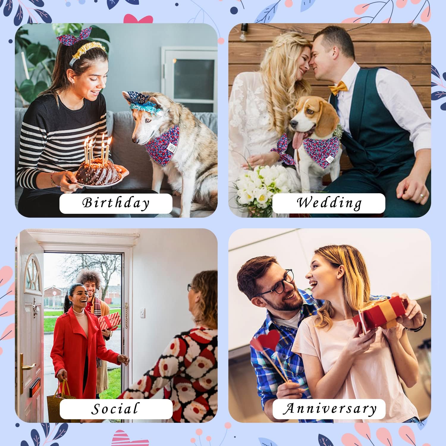 - Matching Bandana and Scrunchie Set- It’s full of love when your pet is wearing the heart dog bandana girl and you are wearing the hair bands. When traveling, taking photos, daily walking and at home, pet neckerchief and bowknot hair scrunchies is a pretty costume for dogs and women. Cute dog spring bandana and scrunchie set with pink heart and white leaves prints, it’s nice photo props.