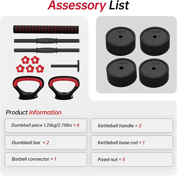 - Package Included: You will receive 8pcs dumbbell pieces 2.75lb / 1.25kg, 5pcs safety fixed nuts, 1pc barbell connector 0.6lb / 0.29kg , 2pcs dumbbell bar 0.5lb / 0.23kg, 1pc kettlebell base rod 0.57lb / 0.26kg, 2pcs kettlebell handle 0.57lb / 0.26kg.