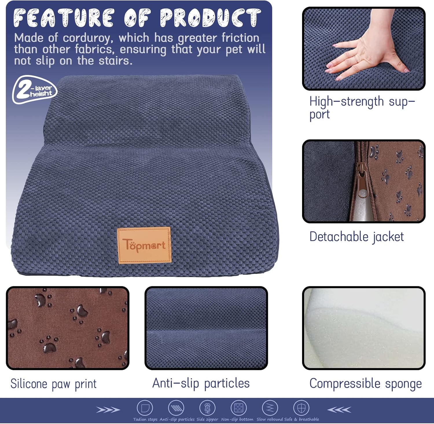 - Safer,Wider&Deeper Steps:Our dog stairs are excellent for those older dogs who are less mobile as they age or for cats with injuries. More wide and deep steps are helpful for reducing the strain that constantly jumping up and down onto lower bed,sofa can have on your pet's joints,and Topmart dog steps will not shake and slip during use. The cover made of corduroy is more frictional than other covers, pets will not slip on the stairs.