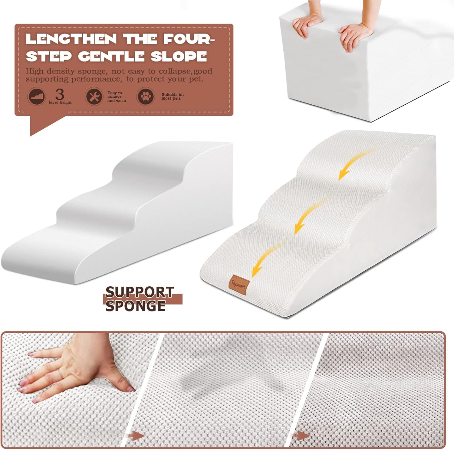 - Easy to Assembly & Clean: The stair cover is removable and machine-washable. Stair made of 30D High density foam,no frame,high rebound, not easy to lose shape. we recommend it for pets weighing less than 60 pounds