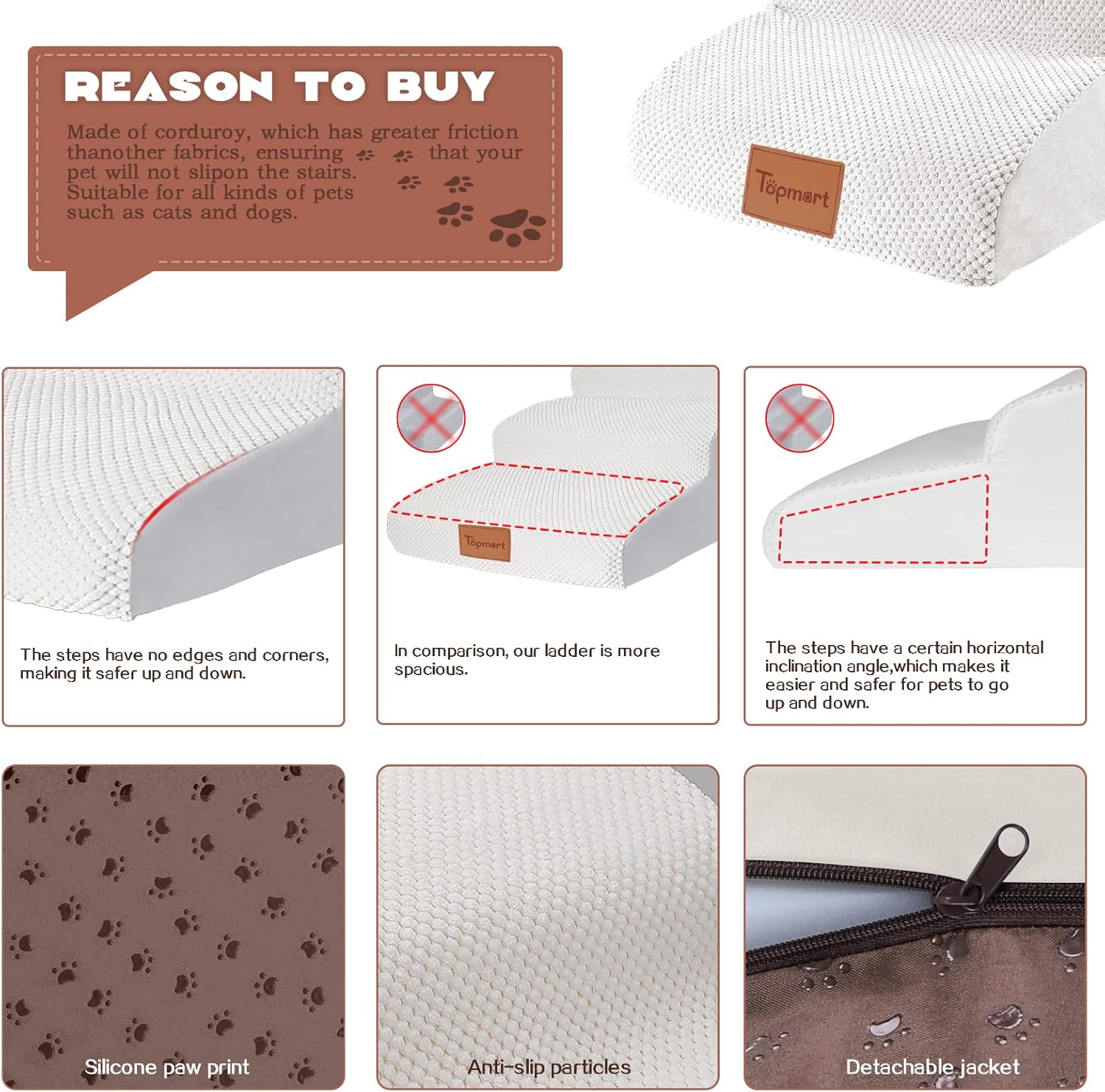 - Safer,Wider&Deeper Steps:Our dog stairs are excellent for those older dogs who are less mobile as they age or for cats with injuries. More wide and deep steps are helpful for reducing the strain that constantly jumping up and down onto lower bed,sofa can have on your pet's joints,and topmart dog steps will not shake and slip during use. The cover made of corduroy is more frictional than other covers, pets will not slip on the stairs.