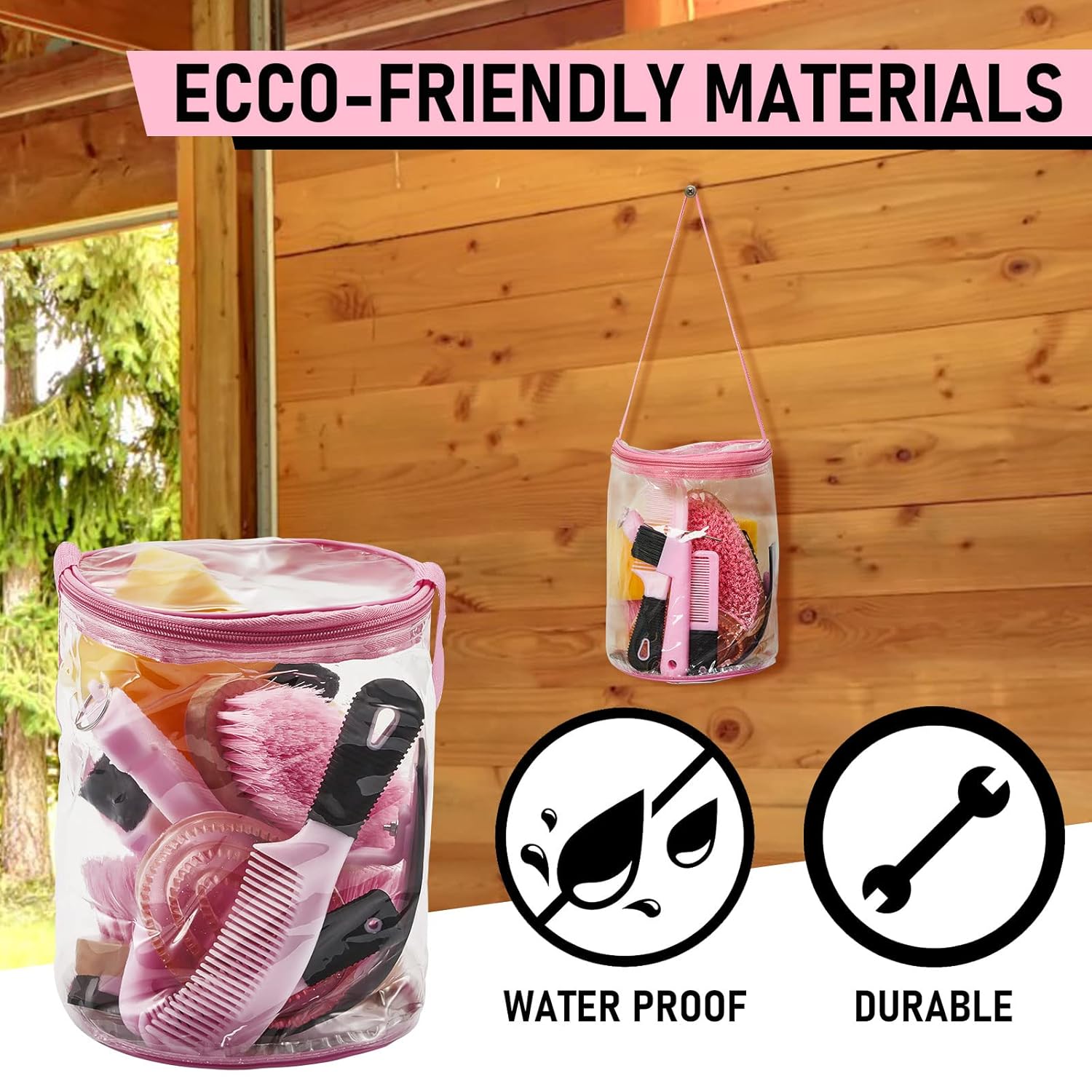 9 Pieces Horse Grooming Kit Tack Room Supplies Set with Organizer Tote Bag, Oval Massage Curry, Hard and Soft Brush, Hoof Pick, Sweat Scraper, Bathing Sponge, Combs for Horse Riders Beginners (Pink)