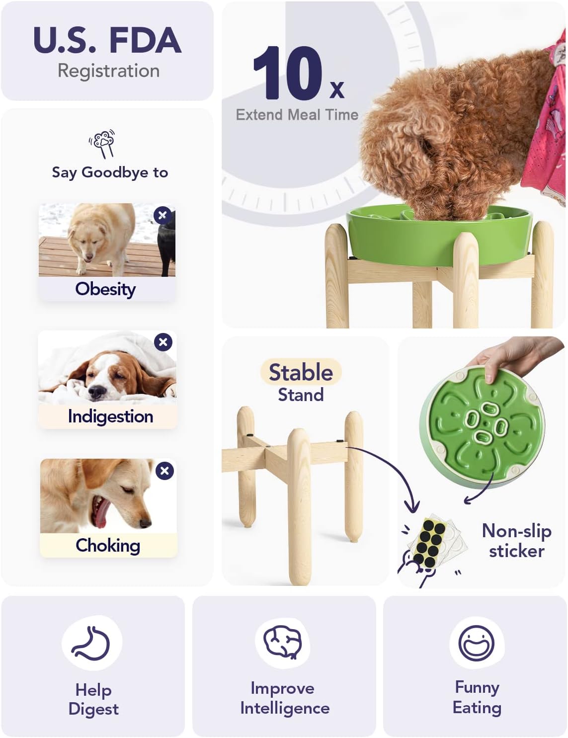 - Slow Down Eating, Bring Dog A Healthy Diet: Fast-eating dogs experience bloat, regurgitation, and obesity easily. Our slow feeder dog bowl design with the ridges and maze pattern helps your dog to eat slower than 10 times. Your dog could change his overeating behavior through a challenge and fun mealtime