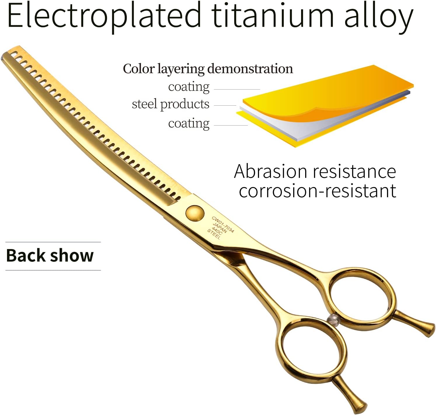 Fenice Peak Professional Dog Grooming Scissors Pet Curved Chunker Shears 7.0'' Extremely Sharp Blades 440C Steel Thinning Scissors Durable Smooth Motion & Fine Cut for Dogs and Cats(Gold)