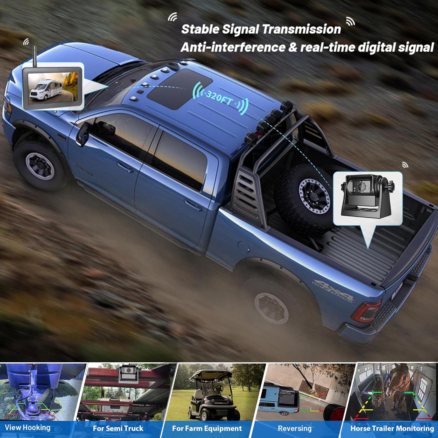 - 100FT Wireless Range: - This wireless backup camera system built-in with strong and stable WiFi signals, which could boast up to 100ft digital range(in open area) Recommend to use at vehicles under 60ft, perfect for Truck, Camper, RV, Trailers, Fifth Wheels, Travel Trailers, Fifth Wheels etc. Easily attach to SUV, Pickup Truck, Travel Trailer, Horse Trailer, RV Camper, Semi Truck, Tractor or Farm Equipment, for monitoring or vehicle reversing