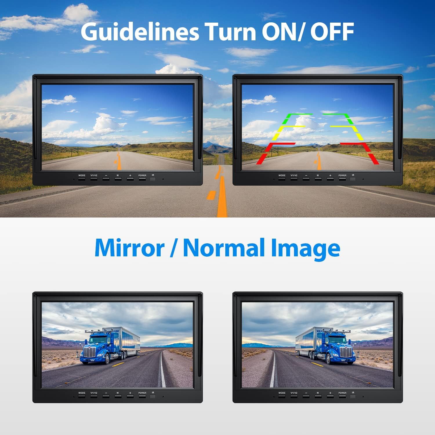 - 🍀Split Screen and Parking Guidelines: The monitor can show the full view for a camera, or dual split screen view, just press CH- button on the monitor to switch views. With the parking guidelines, it can help you to judge the distance between your car and the object around it, which can make your parking safer and easier. What's more, you can change the image to front view or rear view, so you can use one of the camera as the front view camera. Monitor dimension: 9.84 inch(L)*6.46 inch(H)
