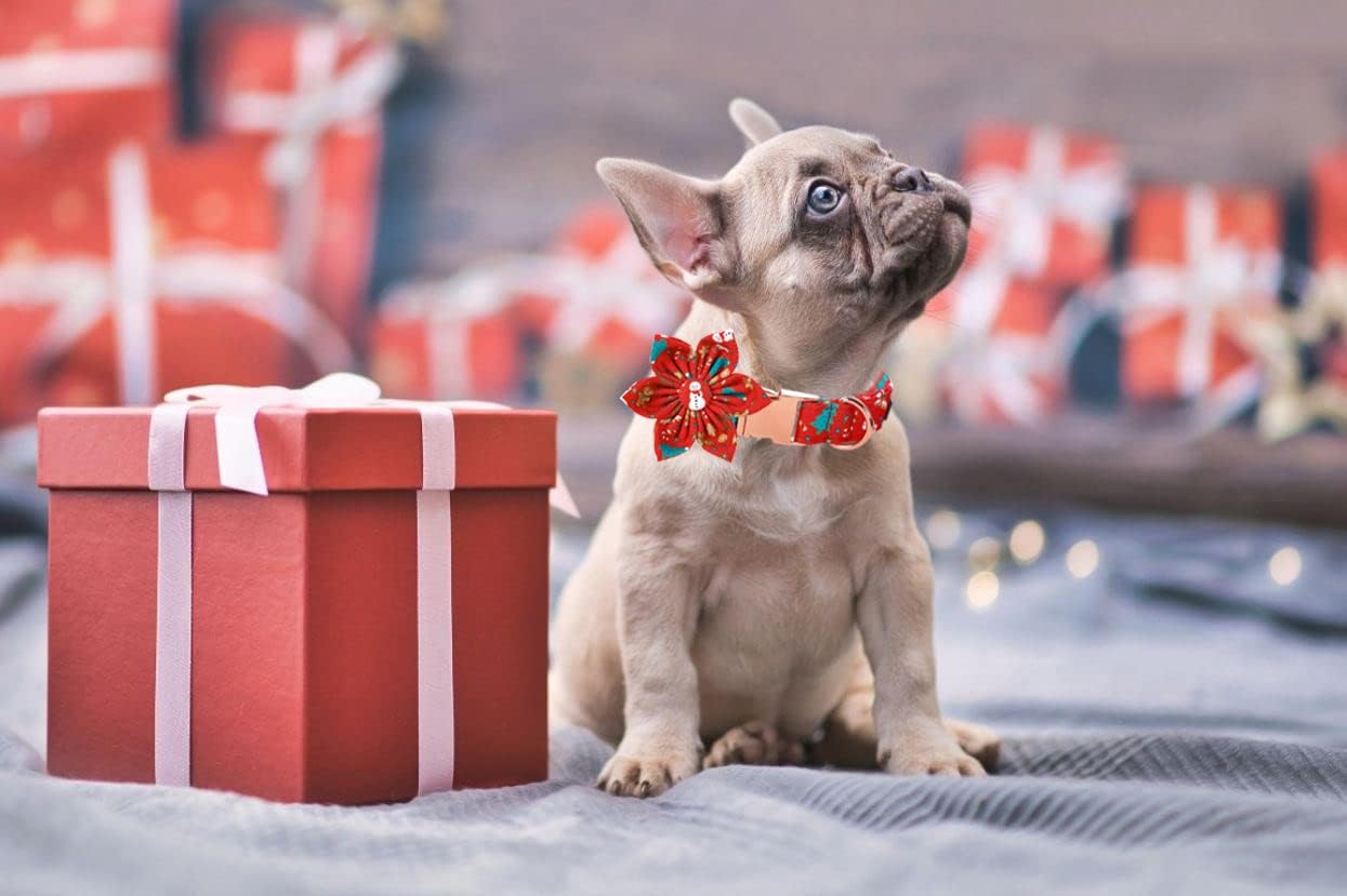 Lionet Paws Christmas Dog Collar with Flower, Dog Flower Collar with Metal Buckle for Dogs, Adjustable Comfortable Dog Collar Girl Gift, M, Neck 13.5-22 in