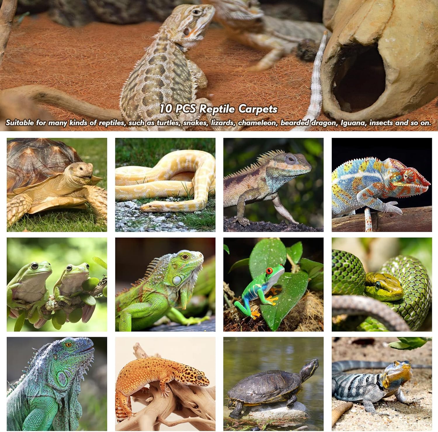 - 【10PCS Coconut Fiber Reptile Carpet】: You will get 10pcs coconut fiber mat, each size is 14 x 14inch(35.6 x 35.6cm) , enought quantity for daily use, such as pet terrarium liner, chicken nesting pads, plant cover mulch mat, etc
