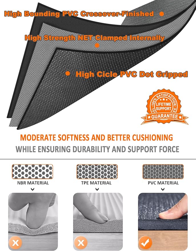 - ✅ UPGRADED ABRASION-RESISTANT NO-SLIP PADDING: Workout mats' top utilizes a smart PVC material, that’s designed to prevent tear and scratch, resisting damages against high impacts caused by dropping equipment such as barbells, dumbbells during training, making exercise mats for home workout easier to wipe up after use. Bottom circle-pattern prevent gym floor mat from sliding around and secure traction and no-slip, mats create perfect combination of heavy-duty toughness, comfort and stability.