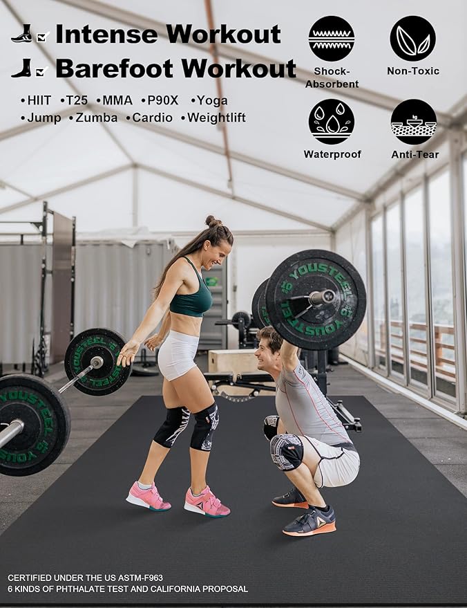 - ✅EXTRA-LARGE HOME GYM MAT COVERS 72 SQUARE FEET: The 12’x6’x7mm large fitness mat instantly transforms any space into a professional gym, giving you and your partners more than enough room to workout on without feeling cramped, and the floor mat is even shoe-friendly, whether you're doing cardio, yoga, weightlift, dance including P90x, MMA, TAM, insanity, T25, Zumba, kettlebell, jumping rope or need large equipment mats to install underneath a treadmill or weight bench, try this exercise mat.