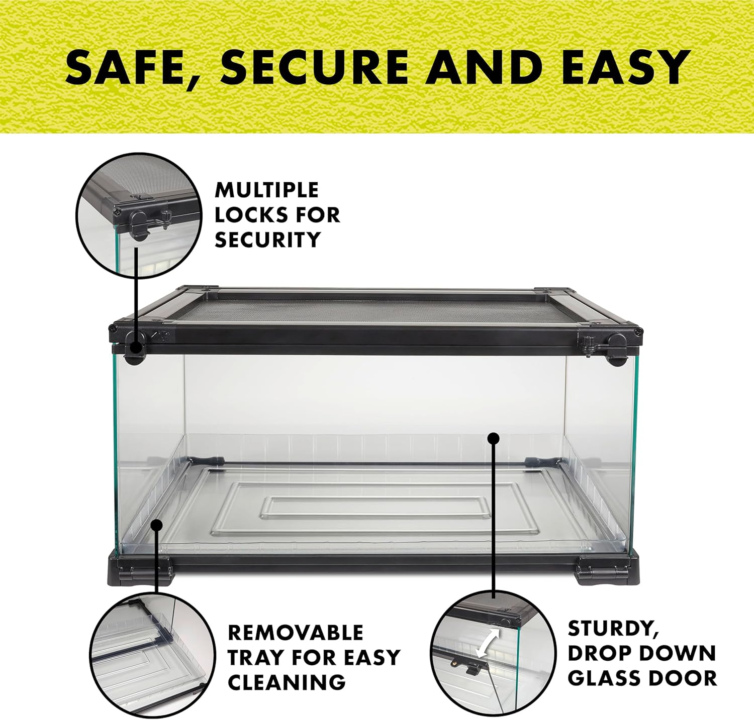 - 🦎 SECURE — The feeding port on the top of the terrarium, the top of the terrarium itself, and the sliding front-opening doors lock to keep pets in their home.