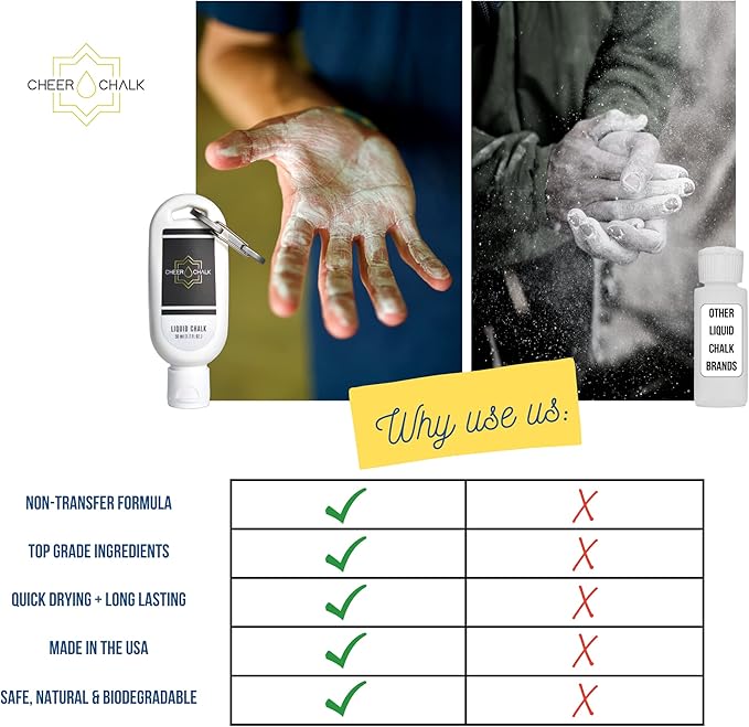 - NON-TRANSFER FORMULA ~ Our unique non-transfer liquid chalk formula, binds the magnesium to the fatty acids in the skin. Powdered gym chalk and cheaper liquid chalk alternatives, create dust that can cause skin, eye, and lung irritation. Cheer Chalk leaves no powder, and no mess; just clean stunts!