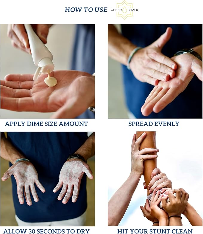 - QUICK-DRYING + LONG-LASTING ~ Cheer Chalk was formulated to meet the demands of elite cheerleading athletes. Quick drying agents bind the magnesium to the skin, and form a long-lasting bonds that leave your hands grippy and dry for hours, through the most intense workouts, practices and performances.