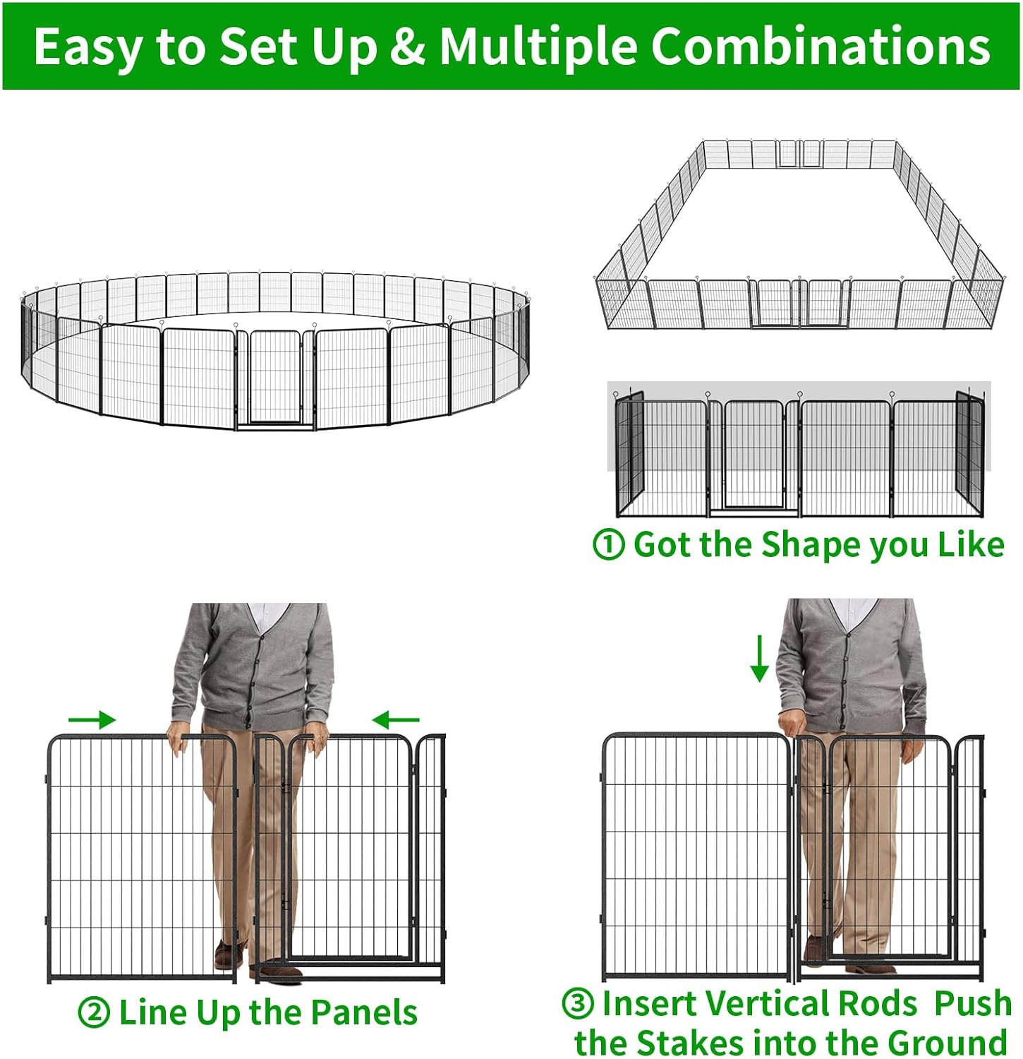 - 【Easy to Set Up & Multiple Combinations】The panels come with individual poles to connect them together, easy to set up or take it down in minutes, dog fence can do multiple combinations and configurations, dog playpen for the yard easily conforms to different shapes according to your garden or room, circle, polygon, irregular, etc