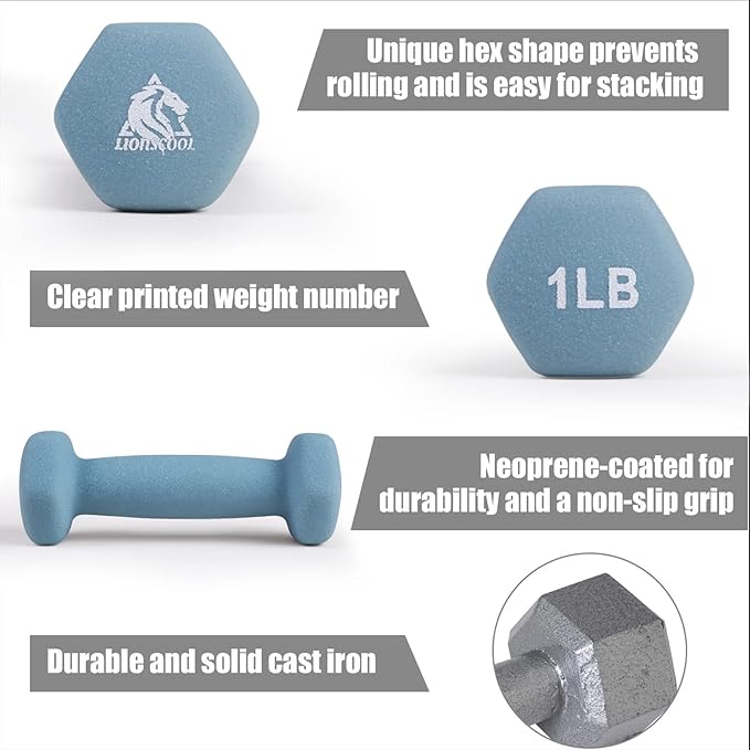 - Comfortable Grip and Anti-Roll Design: The neoprene coating on LIONSCOOL dumbbells offers a comfortable and secure grip and protects fitness equipment from getting damaged. The hexagonal shape of the dumbbell heads prevent the dumbbells from rolling away when setting them down to perform other exercises.