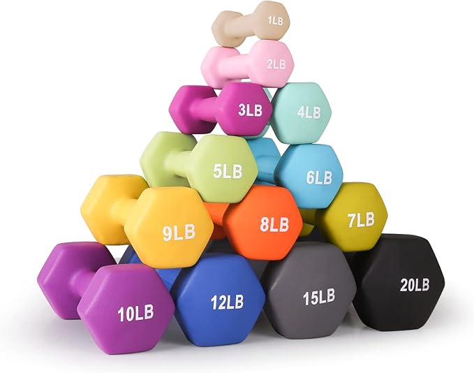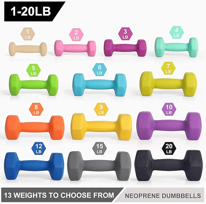 - Choose from 13 Different Sizes:LIONSCOOL neoprene coated dumbbell weights are sold in pairs and available in 1, 2, 3, 4, 5, 6, 7, 8, 9,10,12, 15 and 20 pounds, which allow you vary the intensity of your workouts. Each Dumbbell is color coded with clear printed weight number on the end caps for easy and quick identification.
